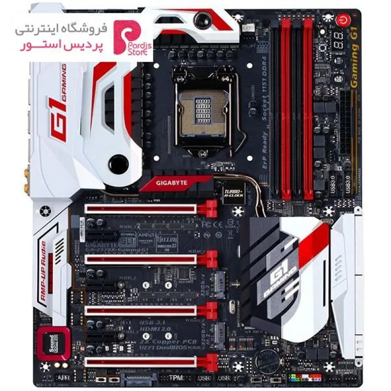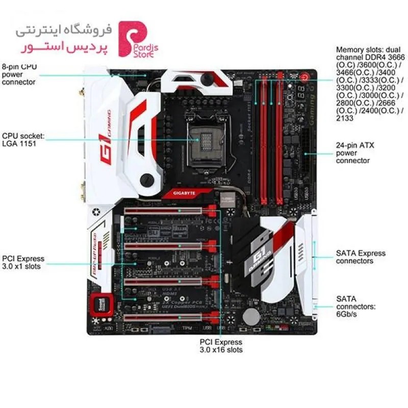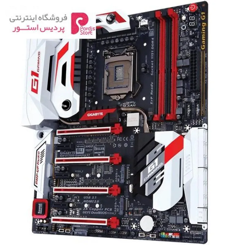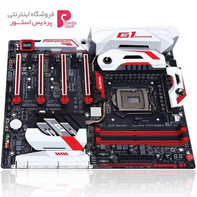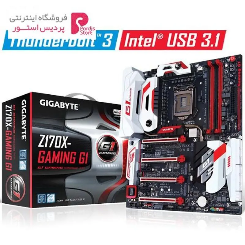 مادربرد GA-Z170X-Gaming G1 گیگابایت (Gigabyte) به چیپست Z170 اینتل مجهز شدهاست و میتوان از پردازندههای Core i7 / Core i5 / Core i3 / Pentium / Celeron نسل ششم اینتل که قابل نصب روی سوکت Intel LGA 1151 هستند در آن استفاده کرد. چهار عدد اسلات DIMM برای نصب حافظه RAM در این مادربرد وجود دارد که میتوان تا 64 گیگابایت حافظه DDR4 را در آن نصب و آنها را به صورت دوکاناله پیکربندی کرد. این مادربرد دارای چهار عدد اسلات PCI Express x16 برای نصب کارت گرافیکی مجزا است که به کمک آن میتوان انواع کارتهای گرافیکی حرفهای را روی مادربرد نصب کرد و از چینشهای مختلف SLI و Crossfire را به خدمت گرفت. مادربرد GA-Z170X-Gaming G1 سه عدد اسلات PCI Express x1 برای افزودن کارتهای توسعه در اختیار شما قرار خواهد داد تا بتوانید از کارتهای جانبی مورد نظرتان در این مادربرد استفاده کنید. گیگابایت در این مادربرد از مواد باکیفیتی استفاده کردهاست روی سوکت پردازنده و اسلاتهای رم و کارت گرافیک را با یک لایه آبکاری طلا پوشانده است؛ استفاده از آبکاری طلا در قسمتهای اتصالی دهنده به کیفیت و ماندگاری بیشتر منجر میشود. در پنل پشتی این مادربرد، پورت خروجی تصویرHDMI را در اختیار خواهید داشت تا در صورت عدم تمایل به استفاده از کارتهای گرافیکی مجزا، بتوانید مانیتورتان را مستقیما به خروجیهای تصویر مادربرد وصل کنید. خروجی صدای مادربرد از نوع 7.1 کاناله است که با استفاده از کارت صدای باکیفیت Creative امکان شنیدن صدایی فراگیر را در اختیار مصرفکننده قرار میدهد. برای ارتباط دادن مادربرد به شبکه به صورت کابلی، دو عدد سوکت LAN گیگابیتی با برند Killer در اختیار خواهید داشت که از سرعت و کیفیت فوقالعاده بالایی برخوردار هستند. وجود دو عدد اسلات M.2 و برد تغذیه 22 فاز و سیستم خنککننده حرفهای از مزایای قابل اشاره این مادبرد هستند. با استفاده از چنین مادربردی میتوانید از جدیدترین قطعات در سیستم کامپیوتری خود استفاده کنید و یک کامپیوتر حرفهای داشتهباشید.